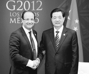 | 6月18日,国家主席胡锦涛在墨西哥洛斯卡沃斯会见法国总统奥朗德。 新华社发 |