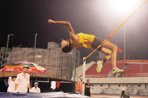 | 海口选手李以杰在田径男子甲组跳高决赛中以1.80米的成绩获得冠军。
