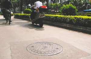 | 6月19日,海口市红城湖路上的窨井。18日下午,这个窨井因井盖被冲开成为坑人陷阱。 本报记者 张杰 摄 |