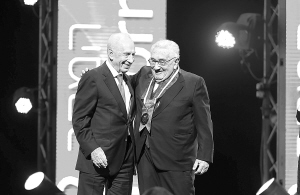 6月19日,在耶路撒冷举行的第四届总统会议上,以色列总统佩雷斯(左)向美国前国务卿亨利·基辛格颁发以色列首个“总统奖”后与其合影。 当日,2012年以色列总统会议在耶路撒冷开幕。以“面向未来”为主题的以色列总统会议,是由以色列总统佩雷斯发起的一个应对全球性挑战的,涉及政治、经济、文化等多领域的高端会议,今年已是第四届,并首次设置“总统奖”。 新华社发