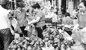 | 端午节将至,海口市西门街头粽子市场热闹红火。不少摊档打出儋州、定安、万宁、澄迈和海口粽子等广告当街摆卖。 本报记者 陈德雄 摄 |