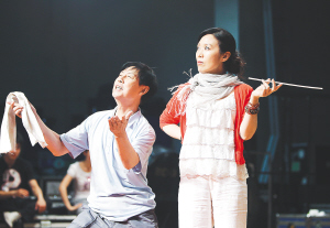 6月20日,吴琼与剧组演员在北京进行紧张排练,吴琼介绍,黄梅音乐剧《贵妇还乡》根据瑞士德语作家迪伦马特的代表作《老妇还乡》改编,讲述了一个亿万富婆回到故居小城,报复年轻时抛弃她的男友的故事,揭露了金钱万能的现象。图为吴琼(右)与剧组演员在一起排练。 新华社发