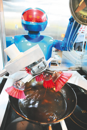6月21日,一家机器人主题餐厅在哈尔滨市中央大街开业。在职“员工”有煮水饺机器人、煮面机器人、炒菜机器人、地面送餐机器人、空中传菜机器人、迎宾机器人等18个各式机器人。它们长相色彩各异,个头1.3至1.6米不等,可以呈现10多种面部表情,会讲简单语句。为防止碰撞客人,每个送餐机器人都装有超声波探测装置进行避障。 新华社发