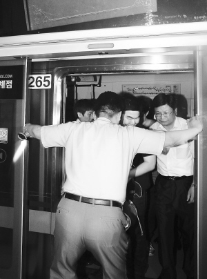 6月21日,在韩国首尔地铁站,救援人员在演习中疏散地铁里的被困乘客。