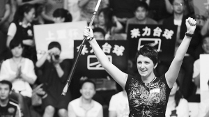 21日,在2012世界女子九球锦标赛决赛中,英国选手凯莉·费雪以9:6战胜中国选手付小芳,获得冠军。 新华社发