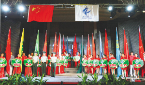 | 6月23日,省第四届体育运动会闭幕式在海口举行,第五届省体育运动会将于2016年在三亚举办。图为在闭幕式上进行交接旗仪式。 |