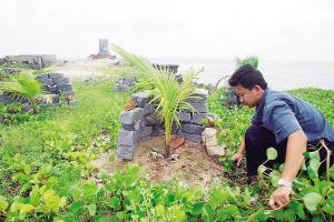 | 驻岛官兵和西沙工委共同在西沙石岛上种植了一批椰子树。