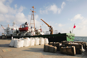 | ↑ 西沙码头,琼沙2号货轮为驻守西沙人员运送各种生产生活物资。 本报记者 王 凯 摄 |