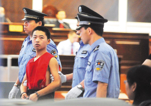 6月25日,王海剑(红衣者)在庭审现场。当日,湖北省高级人民法院对武汉特大银行爆炸案作出二审宣判,裁定驳回三个上诉人的上诉,维持一审判决。主犯王海剑一审被判死刑,从犯王伟、王安安分别被判有期徒刑10年、6年。 2011年12月1日17时30分许,当银行职员提着钱箱准备送上运钞车时发生爆炸,当场致2人死亡,15人受伤。 新华社记者 肖艺九 摄