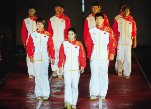6月26日,伦敦奥运会中国体育代表团领奖服———冠军龙服在北京居庸关长城正式亮相。图为郭晶晶(前中)、水上运动员李强(前右)、周玉(前左)等展示冠军龙服。 新华社发
