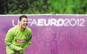 | 6月26日,葡萄牙队训练备战欧洲杯半决赛。图为C罗在训练中开心地大笑。