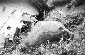 6月27日,人们在江西省靖安县璪都镇黄埔村帮助一受灾户清理因山体滑坡带下的巨石和泥土。 6月21日至27日,江西省出现今年以来持续时间最长、强度最大的强降雨过程。受此影响,江西省靖安县3.2万余人受灾,农作物受灾面积2.7万余亩,177处公路、桥梁坍塌。目前,当地政府全力组织干部群众开展灾后自救,努力把损失降到最低。 新华社发(徐仲庭 摄)