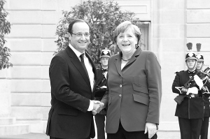 6月27日,法国总统奥朗德(左)在巴黎爱丽舍宫欢迎来访的德国总理默克尔。 法国总统奥朗德27日在巴黎会见来访的德国总理默克尔,双方表示面对危机欧洲应展示团结,加强欧洲一体化建设。 新华社/法新