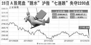 本报讯 两市6月28日呈现高开低走趋势,欧美股指全线上涨,两市双双高开,沪指一度小幅上攻临近五日线后承压回落,随后地产、银行、有色金属等板块加速走低,沪指震荡下行一度逼近2200点,之后石油、酿酒、水泥等板块相继拉升,沪指企稳回升至午盘。午后股指保持震荡盘整趋势,14点后各板块纷纷震荡走低,沪指一路下行失守2200点,深成指震荡翻绿。深圳前海概念持续活跃,受到利好提振的上海本地和保险板块表现强势,两市成交量较前一日有所放大。