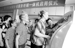 这台省内首次启用的社保服务终端一体机,类似银行的ATM机。得知以后可以大大方便自己办理社保,附近的居民纷纷围聚过来排队,亲自体验一把(见右图,本报记者张杰摄)。