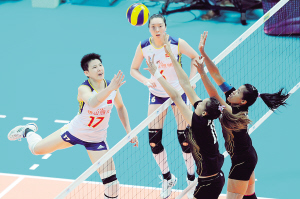 北京时间6月29日晚,在2012年世界女排大奖赛总决赛第三轮比赛中,中国女排以2:3不敌泰国队,遭遇总决赛的两连败,五局比分为25:21、22:25、32:34、25:21和13:15。图为中国队张磊(左)进攻。 新华社发