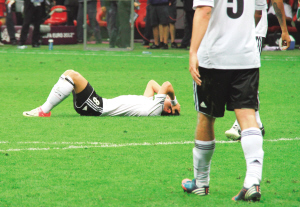 | 德国队球员赛后失望地躺在草坪上。 新华社发 |