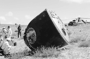 6月29日,地面搜索人员对成功着陆的神九返回舱进行开舱处置。 新华社记者 王建民 摄