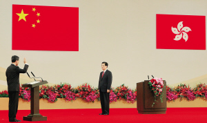 | 7月1日,中共中央总书记、国家主席、中央军委主席胡锦涛监誓,香港特别行政区第四任行政长官梁振英宣誓就职。 新华社记者 鞠鹏 摄 |