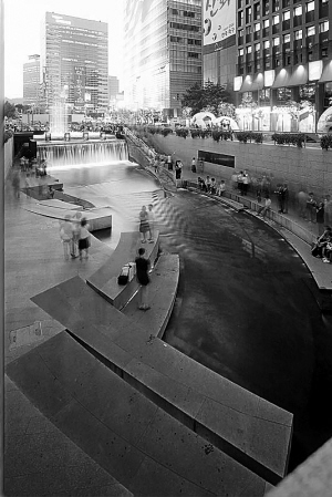 在首尔一片高楼林立的闹市区中,我们见到了在此“闹中取静”的清溪川。清溪川的河水很清,不少人在此休憩,抑或是光着脚丫在河里享受清凉。让人不曾想到的是,这里曾是污水纵横之地。导游介绍,由于城市的发展,清溪川曾被覆盖成为暗渠,清溪川的水质亦因废水排放而变得恶劣。2003年7月起,时任首尔市长李明博推动重新整治清溪川,挖掘河道,并为河流重新美化、灌水等,如今清溪川已成为首尔市中心的一个休闲地点。