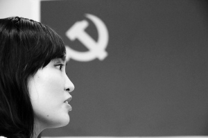 7月1日,张丽莉在党旗前。 当日,经黑龙江省佳木斯市教育局党委批准,因勇救学生而失去双腿的“最美女教师”———佳木斯第十九中学教师张丽莉,在哈尔滨医科大学附属第一医院内面对中国共产党党旗庄严宣誓,成为中国共产党预备党员。新华社记者 王凯 摄