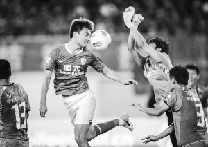 → 7月1日,在中超联赛第15轮比赛中,广州恒大队主场3:2击败北京国安队,夺得半程冠军。图为恒大队球员郜林(左一)头球攻门。 新华社发