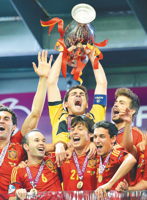 在欧洲足球锦标赛决赛中,西班牙队以四比零战胜意大利队,夺得冠军。西班牙队成为欧锦赛历史上第一支卫冕成功的球队,也是第一支连续在三届大赛中夺冠的球队。 新华社发