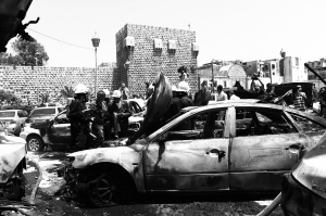 | 叙利亚首都大马士革的汽车炸弹爆炸现场一片狼藉。 新华社/法新 |