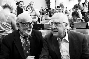 | 7月4日,提出“希格斯机制”的英国爱丁堡大学物理学家彼得·希格斯(右)出席欧洲核子研究中心的发布会。 新华社发 |