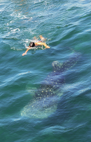| 在渔民护送下,鲸鲨重返大海。 本报记者 苏建强 摄 |