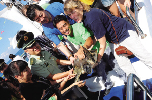 与鲸鲨一同放流的两只大海龟,分别是3个月和4个月前由渔民送到位于新村港的海龟医院的,两只海龟当时均不同程度受伤。经过911国际海龟救助组织的海龟医生治疗痊愈,今天与鲸鲨一起放归大海,其中一只海龟还装上了卫星跟踪装置。