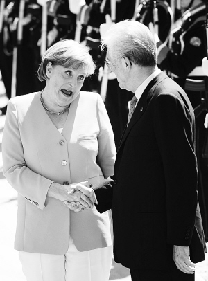 德国总理默克尔(左)和意大利总理蒙蒂交谈时表情夸张。 新华社发