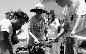 7月4日,来自美国华盛顿大学的20岁大学生朱丽叶(中)正在海南陵水新村港海龟医院做义工,帮助医院开展海龟救助活动。 与朱丽叶一起来到陵水海龟医院做志愿工作的还有来自英国伦敦大学的嘉利珊同学(后立者),她俩都能讲流利的中文,虽然不相识却不约而同选择来海南开展暑假社会实践活动。