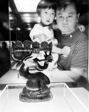 7月5日,《惠世天工》中国古代发明创造文物展在位于杭州的浙江省博物馆开幕。本次展览共展出精品文物312件(组),再现了中国的茶、漆器、铜镜和酒的历史。图为观众在欣赏战国时期的彩绘龙蛇座花瓣盘豆。