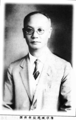 这是一张发黄的老照片,照片上的人目光笃定,唇瓣紧抿,一副圆框眼镜将他衬托得愈发儒雅。每隔10年,香港海南商会都出版一本厚重的纪念特刊,这张照片始终都放在特刊的前面部分。他就是香港海南商会的创始人、当时香港的琼人首富周雨亭。