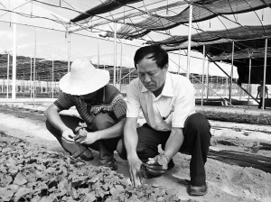 | 梁亚宽与育种基地技术员在察看航天西瓜苗长势。吴棉 摄 |