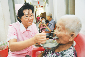 | 海口椰岛之家老年公寓里,李萍正在照料老人。 本报记者 王凯 摄 |