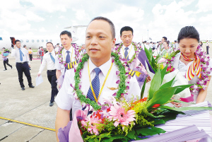 7月8日上午,机长邹劲松率领“6·29”反劫机英雄机组人员抵达海口美兰机场。 据悉,省委、省政府9日将在海口召开“6·29”反劫机英雄机组表彰大会,表彰、奖励“6·29”反劫机英雄机组集体和个人。 省委常委、秘书长孙新阳,省政府秘书长徐庄到机场迎接机组人员。 本报记者 苏晓杰 通讯员 全超 摄