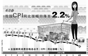 新华社北京7月9日电 (记者刘铮 江国成)国家统计局9日发布报告,6月份全国居民消费价格总水平(CPI)同比上涨2.2%,涨幅比上月大幅回落0.8个百分点。
