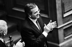 7月9日,在希腊首都雅典,希腊总理萨马拉斯在新政府赢得议会信任投票后鼓掌。此举为新政府与国际债权人谈判两轮救助协议中的部分条款扫清了道路。新华社/法新
