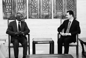 | 7月9日,在叙利亚首都大马士革,叙利亚总统巴沙尔·阿萨德(右)会见联合国-阿盟叙利亚问题联合特使安南。 新华社/叙通社 |
