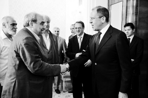 | 7月9日,俄罗斯外交部长拉夫罗夫(右前)在莫斯科与叙反对派代表团团长米歇尔·基洛握手。当日,俄罗斯外交部长拉夫罗夫会见了叙利亚反对派代表团。 新华社发(巴维尔摄) |