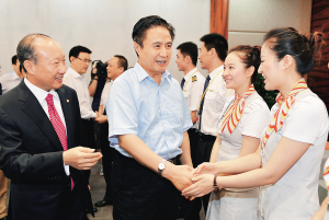 | 7月9日,省委、省政府在海口举行大会,隆重表彰“6·29”反劫机英雄机组。图为表彰大会前,省委书记、省人大常委会主任罗保铭,省委副书记、省长蒋定之等领导会见反劫机英雄机组成员。 本报记者 王凯 摄