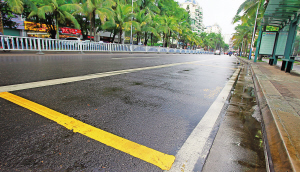 7月8日,海口市海德路公交站,海口交警部门新划设的公交专用停靠站台标志线投入使用,到站公交车辆将有序地停靠在黄色标志线内,方便市民快速有序地上下车。 据悉,黄色标志线划设区域是指公交车可停靠区域,其他车辆不得在此区域停靠。 本报记者 李英挺 摄