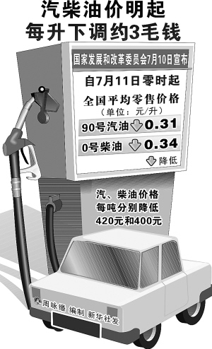本报讯 据财经网报道,发改委于7月11日凌晨起下调国内汽柴油零售价,汽油降幅420元/吨,柴油降幅400元/吨,折合升价汽油下降0.32元/升,柴油下降0.34元/升。此次下调,创成品油定价机制改革以来的首个成品油价“三连跌”。