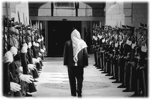 | 在约旦河西岸城市伯利恒拍摄的阿拉法特的背影(资料照片)。 新华社发 |