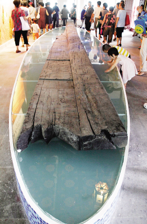 ③7月11日,游客在南京宝船厂遗址观看出土的“大舵杆”。