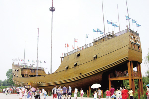 ①7月11日,游人在南京宝船厂遗址参观郑和下西洋仿古宝船。
