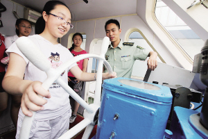 ②7月11日,江苏省镇江市大港镇中学生沈星宇在镇江边检站体验驾驶检查艇。