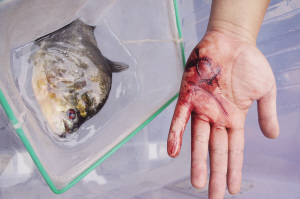 柳州一市民的手掌被食人鲳咬伤,这条咬伤人的食人鲳有着锋利的牙齿。 新华社发